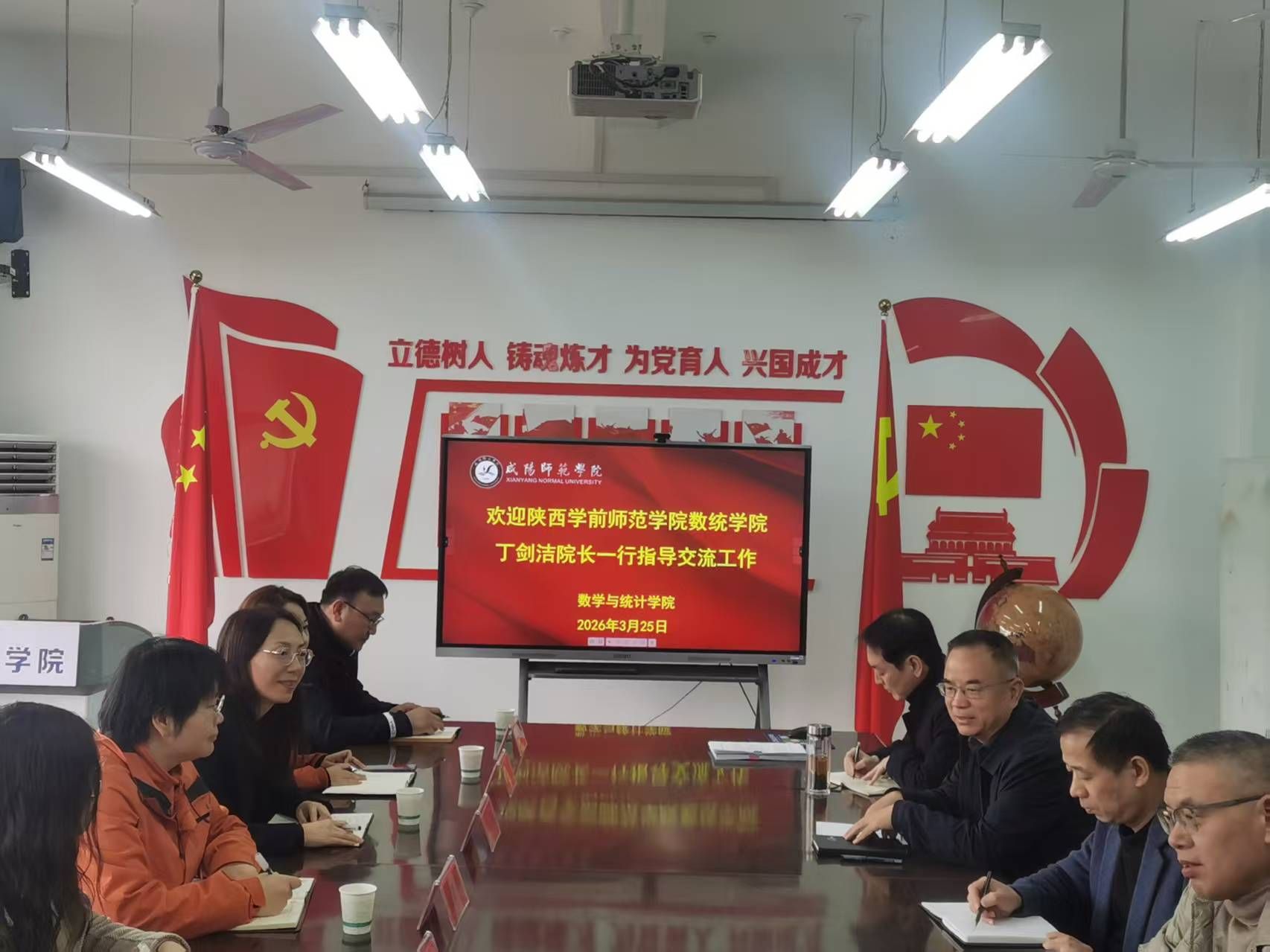 3月25日下午,陕西学前师范学院数学与统计学院丁剑洁院长一行6人来我院交流学习。院长任刚练热情接见并召开座谈会,学院领导班子、专业负责人等参加。